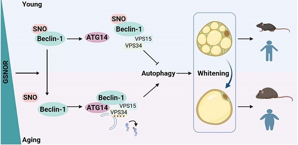 图. 衰老相关肥胖中GSNOR促进自噬从而导致脂肪组织白色化的分子机制示意图