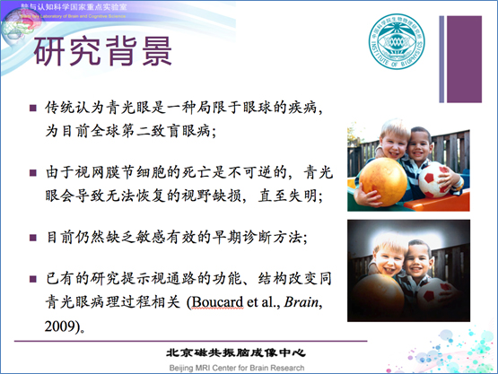 2. 和同仁医院合作关于“青光眼患者视皮层功能损害”的研究,率先将功能成像技术引入对青光眼(开角型)皮层功能损害神经机制的探索工作,成果发表于2010年的 Investigative Ophthalmology and Visual Science(IOVS,眼科学界基础研究杂志中排名 Top 2)。目前正在开展皮层功能损害的脑血流、代谢、结构等多重生物学指标的探索研究。