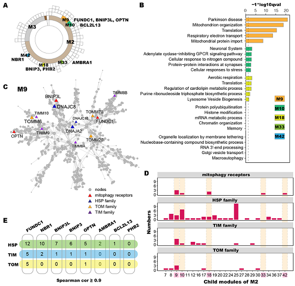 研究人员通过生物信息学分析、结合细胞模型和果蝇模型系统地研究了线粒体自噬受体FUNDC1调节TDP-43蛋白质稳态的分子机制。对GEO数据库中TDP-43蛋白病RNA-seq数据进行相关性分析和共表达网络构建,发现线粒体自噬受体基因FUNDC1TDP-43以及HSP70/HSP40/TOM家族的多个成员存在共表达关系(图1)。在细胞模型中,尽管FUNDC1与TDP-43没有直接的蛋白-蛋白相互作用,但是过表达TDP-43会增加FUNDC1的水平,且FUNDC1促进TDP-43的线粒体定位。生化实验表明,FUNDC1和TDP-43可分别与TOM70、HSPA8和DNAJA2相互作用,而且后三种蛋白与TDP-43的线粒体输入密切相关。进一步实验证明,FUNDC1通过促进TDP-43-TOM70和DNAJA2-TOM70的相互作用来增加TDP-43的线粒体定位,且此效应独立于FUNDC1的LC3相互作用区域LIR。在TDP-43蛋白病转基因果蝇模型中,过表达FUNDC1会增强TDP-43诱导的线粒体损伤,而下调FUNDC1可部分挽救TDP-43诱导的线粒体损伤。在类神经元细胞SH-SY5Y中,过表达FUNDC1通过增加线粒体蛋白酶LONP1水平和激活线粒体自噬来调节细胞质中TDP-43的蛋白水平。总之,FUNDC1通过调节与线粒体蛋白输入途径相关的蛋白质机器促进TDP-43的线粒体输入,且FUNDC1介导的线粒体质量控制在TDP-43蛋白的稳态调控中发挥重要作用(图2)。