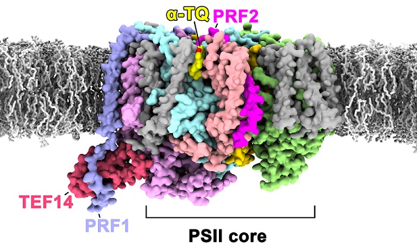 2024年6月18日,中国科学院生物物理研究所柳振峰研究组联合西湖大学李小波研究组和中国科学院植物研究所田利金研究组,在《Nature Communications》期刊上发表题为"Structural basis for an early stage of the photosystem II repair cycle in Chlamydomonas reinhardtii"的研究论文。该项工作综合应用生物化学、质谱分析和冷冻电镜技术,发现在高光条件下制备的PSII核心单体复合物上结合了TEF14(Thylakoid Enriched Factor 14)、PRF1(Photosystem II Repair Factor 1)和PRF2(Photosystem II Repair Factor 2)这三个蛋白因子以及一个α-生育酚醌分子(α-tocopherol quinone,α-TQ),并因此将该复合物命名为PSII-TPP复合物(图1)。