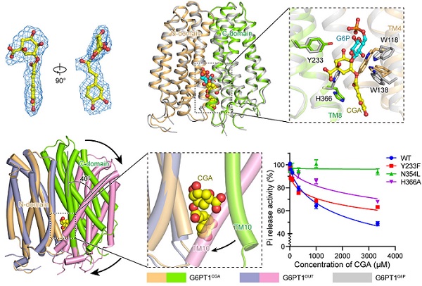 在维持机体血糖稳态的精密调节网络中,肝脏的葡萄糖输出扮演着核心角色。葡萄糖-6-磷酸(G6P)作为糖原分解与糖异生途径的共同终末产物,其向内质网腔的跨膜转运是肝脏释放葡萄糖至血液循环的限速步骤。执行这一关键转运任务的,是内质网膜上的葡萄糖-6-磷酸转运蛋白1(G6PT1,由SLC37A4基因编码)。G6PT1的功能完整性至关重要:其功能的完全丧失会导致一种严重的常染色体隐性遗传代谢病--Ib型糖原贮积症(GSD1b),患者表现为危及生命的低血糖、肝肿大及中性粒细胞功能障碍;另一方面,在2型糖尿病中,适度且可逆地抑制G6PT1活性,可有效降低肝脏过度的葡萄糖输出,因而成为调控血糖的一个具有潜力的治疗策略。研究表明,天然化合物绿原酸(CGA)能够抑制G6PT1,在临床实验中显示出有效降低2型糖尿病患者血糖水平的作用,因此被视为一种前景广阔的潜在抗糖尿病药物。尽管其生理与病理意义重大,但G6PT1如何识别底物、磷酸如何耦合驱动G6P转运、其构象如何动态变化,以及天然抑制剂绿原酸如何实现特异性抑制等分子层面的核心机制,长期以来仍然是悬而未决的问题。