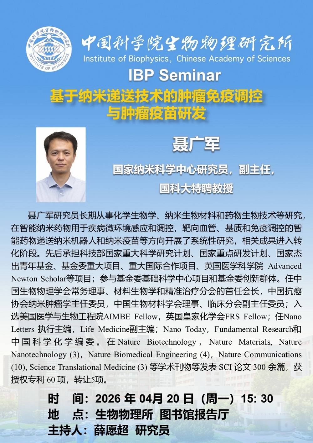 2026年4月20日下午15:30 IBP Seminar:基于纳米递送技术的肿瘤免疫调控与肿瘤疫苗研发