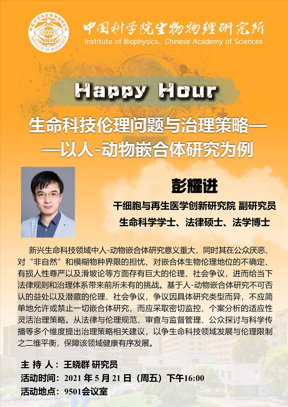 2021年5月21日下午16:00 Happy Hour:生命科技伦理问题与治理策略--以人-动物嵌合体研究为例