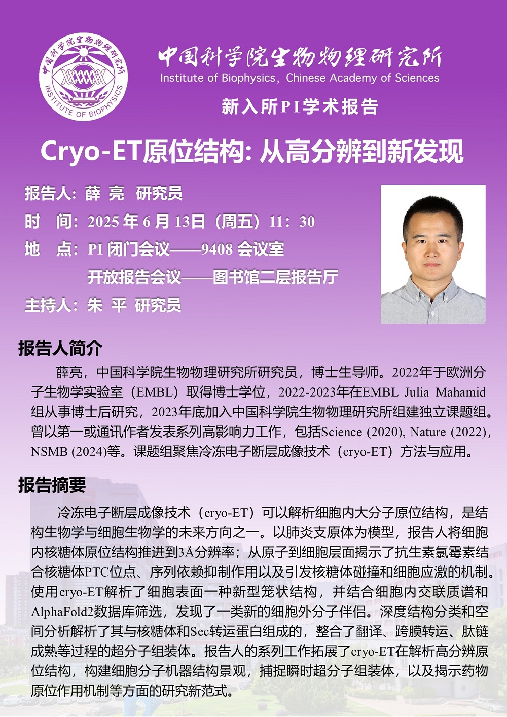 2025年6月13日中午11:30 新入所PI学术报告:Cryo-ET原位结构: 从高分辨到新发现