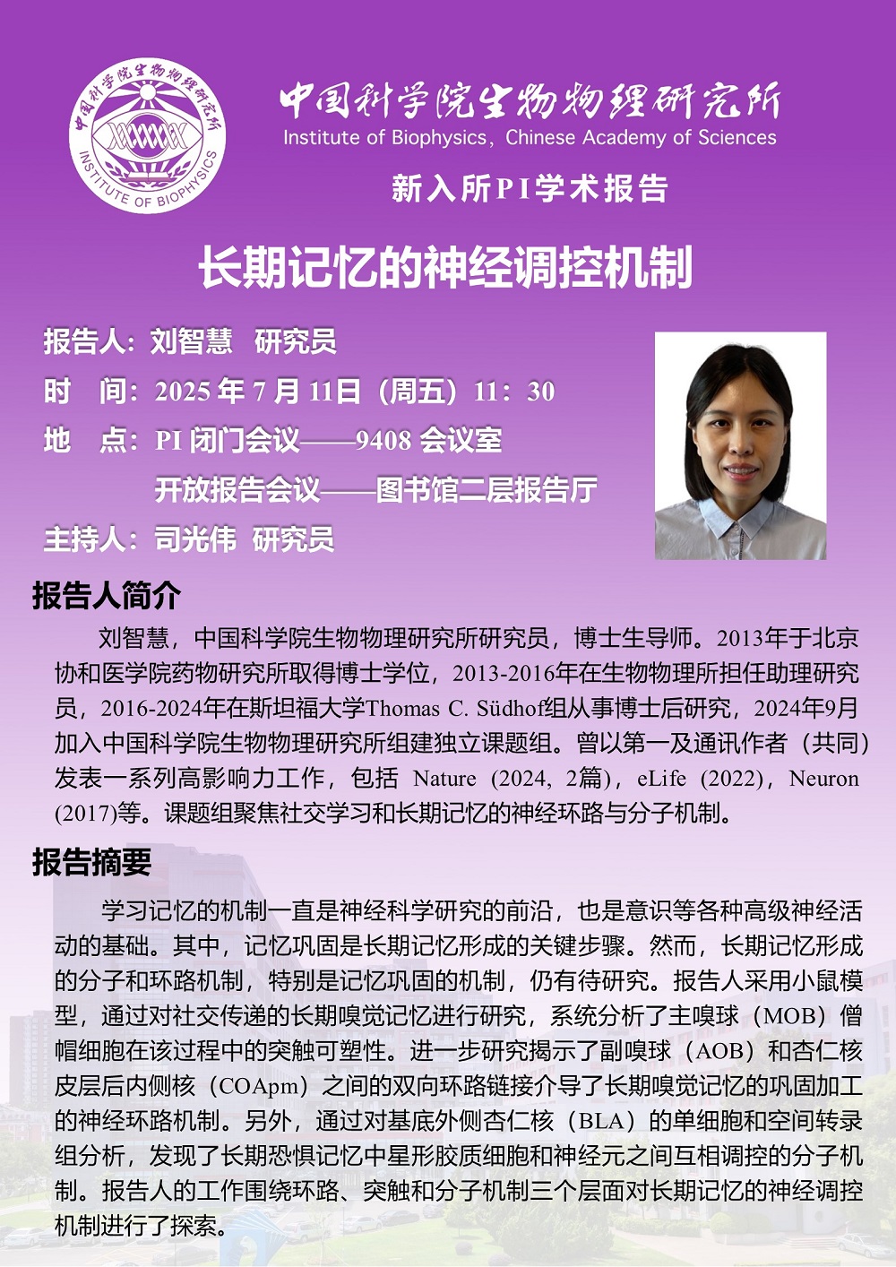 2025年7月11日中午11:30 新入所PI学术报告:长期记忆的神经调控机制