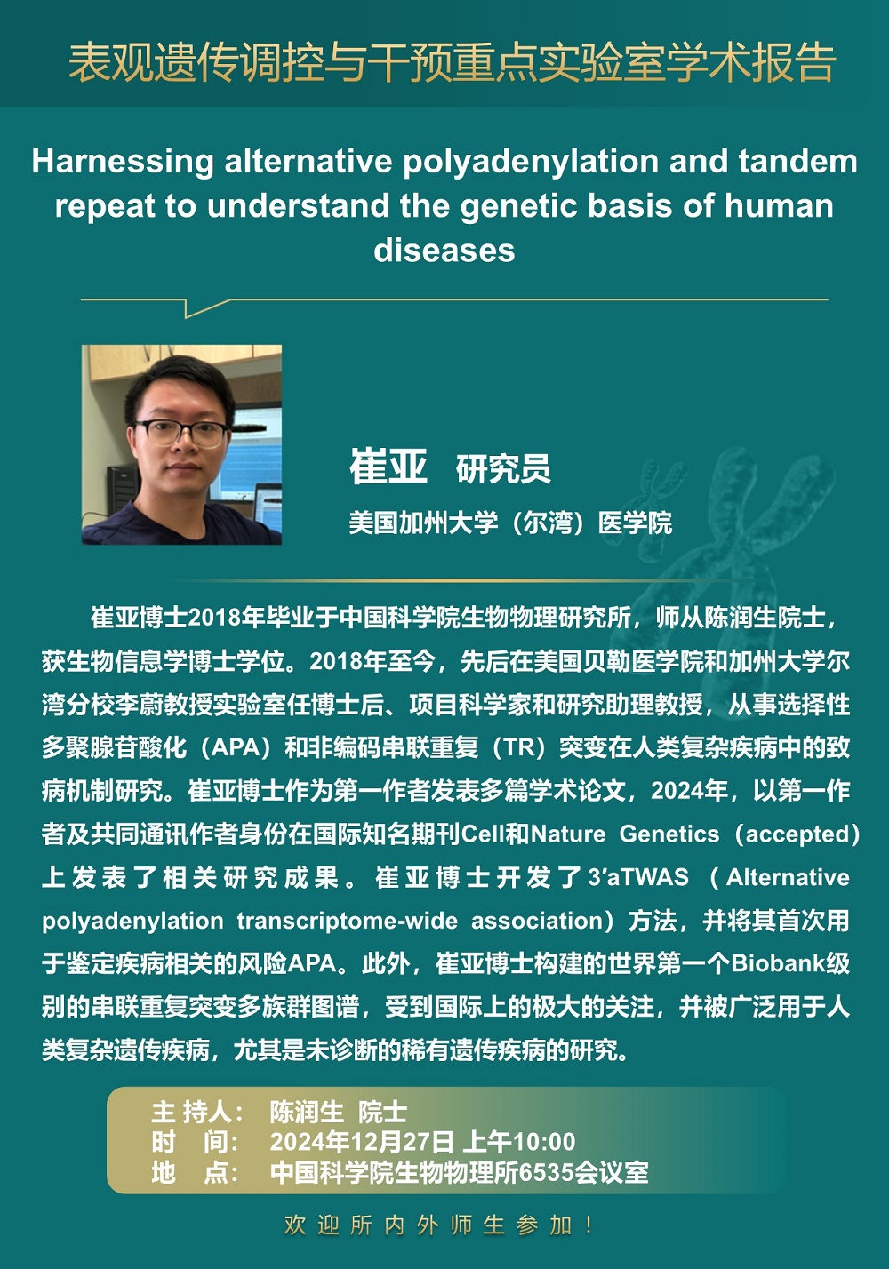 2024年12月27日上午10:00 表观遗传调控与干预重点实验室学术报告:Harnessing alternative polyadenylation and tandem repeat to understand the genetic basis of human diseases