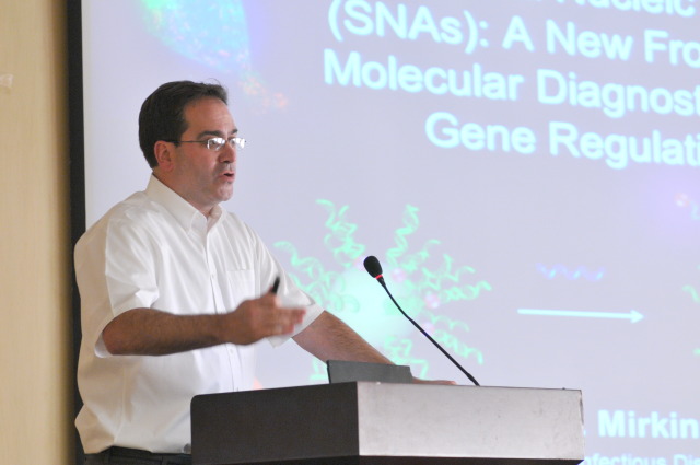 在本次报告中,Chad Mirkin教授主要介绍了他和他的团队在纳米科学和技术与药物研究相结合方面取得的成果,及如何应用DNA检测技术来进行艾滋病,天花,肝炎和癌症等疾病的早期诊断,以及采用金纳米颗粒包裹DNA进行药物转运方面的研究。