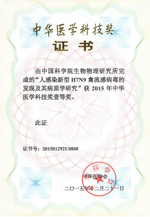 中国科学院生物物理研究所蒋太交研究员参与完成的“人感染新型H7N9禽流感病毒的发现及其病原学研究”,荣获2015年中华医学科技奖一等奖。蒋太交课题组的研究,阐明了新型H7N9禽流感病毒是于2011~2012年左右,在我国长三角地区,由来自野禽与家禽中流行的病毒,通过至少两次重配而产生的,对于H7N9病毒的溯源认识具有重要意义。