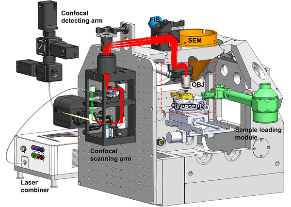 为了解决这一技术瓶颈,徐涛院士组和纪伟组联合北京大学郭强团队,研制出集成式冷冻光电融合聚焦离子束系统(cryogenic correlated light, ion and electron microscopy,cryo-CLIEM)。这套系统将激光共聚焦显微镜集成到商业化双束电镜中,成功实现了双束电镜内冷冻三维多色荧光成像,以便捷高效的开展靶向样品减薄制备。