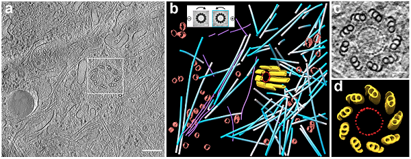 图4: HeLa细胞中心粒的原位成像研究。(a)含有中心粒(方框)的cryo-ET三维重构图像。(b)中心粒及其周围结构的分割渲染图。(c)a中方框部分的局部放大图。(d)中心粒的三维结构建模。Scale bars:a,200 nm;b inset 10 nm;c,50 nm。