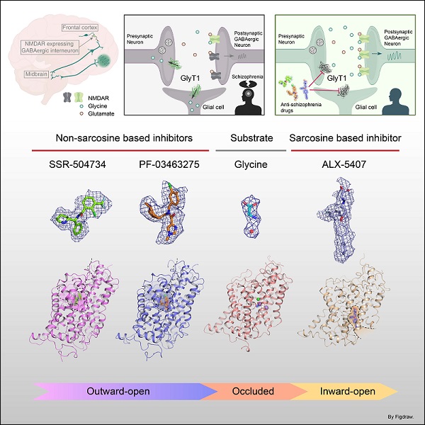 精神分裂症(schizophrenia)是一种高致残率的精神疾病,至少困扰世界上约1%的人口。其临床特征为阳性症状(幻觉、妄想)、阴性症状(情绪扁平、社交失能)和认知障碍。阳性症状目前已有临床药物进行治疗,而长期影响患者社会功能和生活质量的阴性症状和认知障碍仍缺乏有效的治疗手段。大量研究支持NMDA受体的功能减退是致病机制之一,增强NMDA受体的功能有潜力治疗精神分裂症阴性症状和认知障碍。虽然直接口服NMDA受体激动剂甘氨酸可以显著减轻阴性症状、改善认知能力,但由于用药剂量高、治疗窗口期窄、中枢神经系统渗透率差、以及伴随而来的副作用和潜在的药物相互作用等而应用受限。由于GlyT1与NMDA受体高度共定位,抑制GlyT1可以提高突触间隙的甘氨酸浓度,促进NMDA受体激活。因此,GlyT1被认为是治疗精神分裂症的关键靶点之一,多家制药企业开发了选择性抑制GlyT1的化合物作为精神分裂症的候选治疗药物,并开展了大量临床研究。然而,目前针对GlyT1的治疗精神分裂症的药物仍处在临床试验阶段,探究GlyT1底物识别、离子结合、构象变化以及与其它临床试验药物分子之间的构效关系,有助于加速靶向GlyT1的药物开发进程。