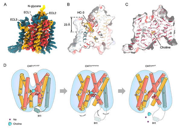 CHT1(SLC5A7)是钠离子/溶质同向转运家族成员,借助细胞内外钠离子的电化学势,驱动胆碱的高亲和力跨膜转运。HC-3(hemicholinium-3)是选择性靶向CHT1的小分子药物,竞争性地抑制了CHT1介导的胆碱转运,被用作神经肌肉阻滞剂。然而,人们对CHT1识别胆碱的关键位点尚不明确,其构象变化的结构基础以及小分子HC-3对转运活性的抑制机制也有待阐明。