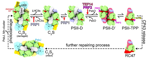 植物、藻类和蓝细菌通过光合作用过程将光能转化为化学能,源源不断地为地球上的各种生命体提供能源和呼吸所需的氧气。光系统 II (photosystem II,PSII)是放氧型光合作用体系中的能量转换器,利用光能来驱动水:质体醌的氧化还原反应过程,将水分子裂解为氧气和质子,并还原质体醌生成质体醌醇。PSII催化的反应需要在光能的激发和驱动下才能发生,然而PSII中的功能基团非常容易在光照的诱导下和在光合过程中产生的副产物活性氧的作用下受到损伤而失去活性。受到损伤的PSII需要通过一个被称为PSII修复循环的复杂生物学过程来恢复功能。在绿藻和植物叶绿体中,PSII通常与捕光复合物LHCII组装形成PSII-LHCII超复合物,受到损伤的PSII-LHCII超复合物需要被逐步解组装形成一些中间态的亚复合物,并将其中损伤最为严重的D1亚基暴露给叶绿体蛋白酶进行降解。随后,一条新生的D1肽链被叶绿体核糖体合成并插入到类囊体膜内,与色素分子和其它亚基逐步组装在一起,最终形成一个完整的有功能的PSII-LHCII超复合物。