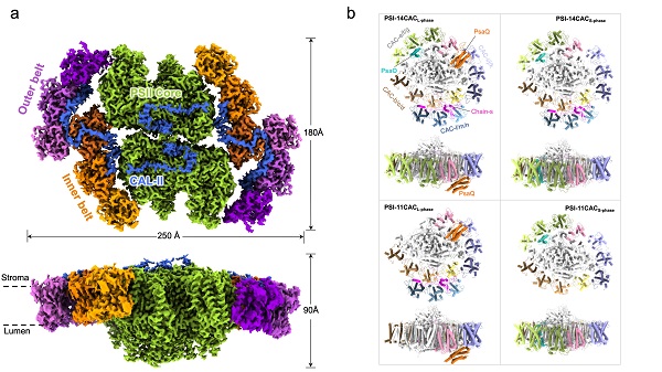 图1.(a)PSII-CAC复合物的电镜密度。(b)四种PSI-CAC复合物的结构。
