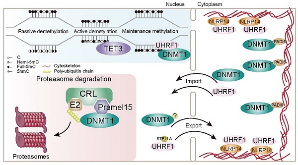 哺乳动物卵细胞受精后形成的受精卵会经历DNA甲基化的重编程,将继承自亲本的基因组甲基化状态重置,为后续的组织分化、胚胎发育做准备。DNA甲基化重编程的异常可能会导致胚胎发育异常、子代的生理缺陷等问题。在早期胚胎发育的DNA甲基化重编程过程中,基因组会表现出大范围的DNA去甲基化。DNA复制依赖的被动去甲基化是其主要驱动力。DNA甲基化维持的重要DNA甲基转移酶DNMT1(DNA methyltransferase 1)及其辅助蛋白UHRF1在卵细胞和早期胚胎中的细胞质滞留被认为是这一时期基因组发生DNA被动去甲基化的主要原因。双加氧酶TET(Ten-eleven translocation)家族蛋白能够通过将5-甲基胞嘧啶(5mC)连续氧化,产生5-强甲基胞嘧啶(5hmC),5-醛基胞嘧啶(5fC),和5-羧基胞嘧啶(5caC)。这些氧化产物既可以随着DNA复制逐渐还原成胞嘧啶,也可以通过剪辑切除修复机制还原成胞嘧啶。后者由于不依赖于DNA复制,被称为DNA主动去甲基化。其中,TET3是卵细胞中唯一表达的TET蛋白,其介导的特定区域的主动去甲基化也帮助了早期胚胎的DNA甲基化重编程。TET3的缺陷会导致子代代谢异常,出现糖尿病易感问题。尽管全基因组范围DNA去甲基化是早期胚胎发育过程中DNA甲基化重编程的主要特征,进一步的研究发现在这一阶段同时存在着重要区域DNA甲基化的维持,例如印记基因和反转录元件等。母源缺失DNMT1导致这些区域DNA甲基化无法在DNA甲基化重编程过程中维持,进而引起后续胚胎发育异常和致死。除此之外,一些研究发现受精后还会发生依赖于DNMT1和DNMT3A的从头DNA甲基化建立。早期胚胎DNA甲基化重编程的过程存在着以上诸多不同的DNA甲基化调控事件,直接参与其中的蛋白,如DNMT1,UHRF1等的功能也有很多研究。然而,这些蛋白是如何被调控,并在DNA甲基化重编程过程中发挥适当作用的机制仍有待阐明。