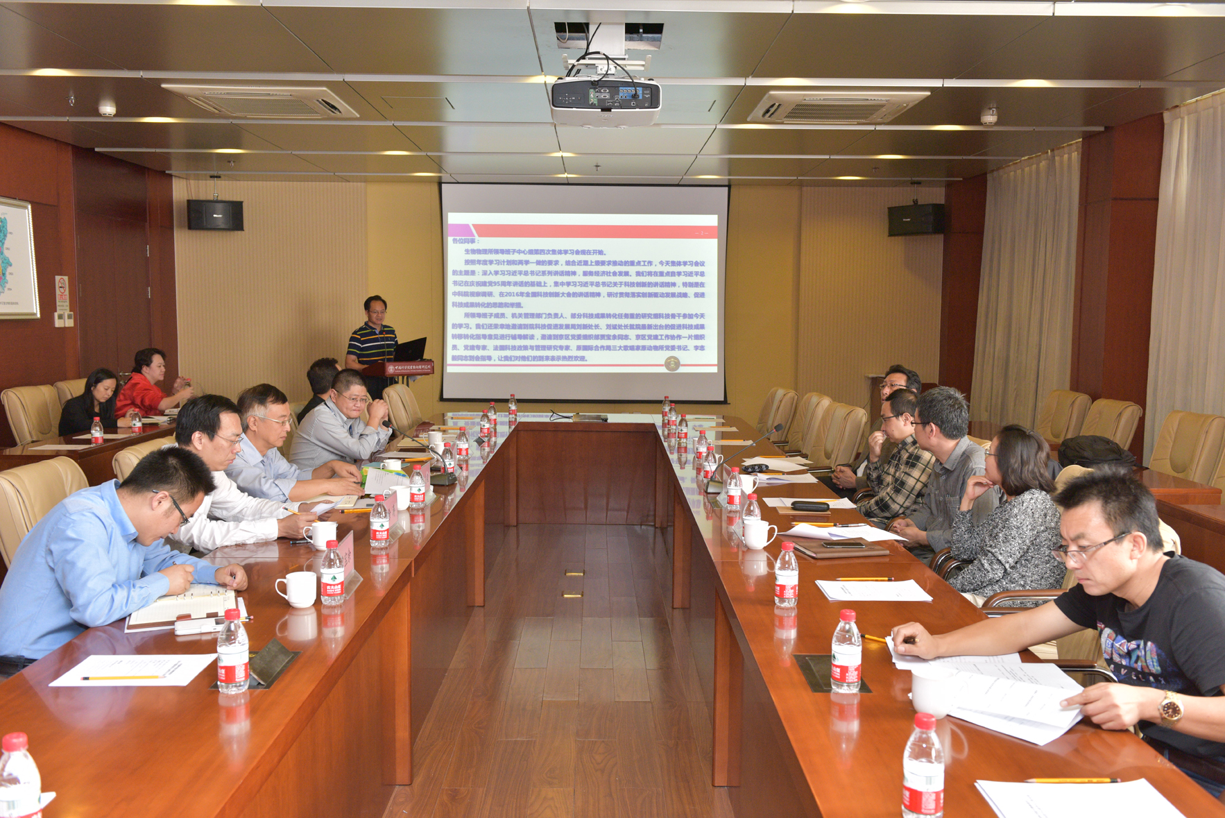 汪洪岩书记向党委中心组会议做了报告,主要内容包括党委中心组学习制度的建立和发展、总书记关于科技创新的讲话精神和生物物理所科技成果转化发展历程。他指出,党委中心组学习是研究所领导班子为实现发展目标而进行的理论学习工作,是领导班子建设的重要内容。还集中学习了习近平总书记关于科技创新的讲话精神,特别是在中科院视察调研、在2016年全国科技创新大会的讲话精神,研讨了贯彻落实创新驱动发展战略、促进科技成果转化的思路和举措。