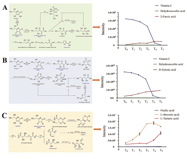 研究团队通过50 ℃热敷育模拟CRRTJ胀气过程,借助UPLC- QTRAP- MS/MS技术对不同时间节点的CRRTJ样品进行检测,共鉴定出生物碱、黄酮、氨基酸及衍生物等十二类2242种代谢物。通过多元统计分析,研究团队将目标锁定在刺梨"引以为傲"的成分-维生素C(Vc)。结果显示,在CRRTJ胀气过程中,高含量的Vc及其手性异构体异抗坏血酸(D-Vc)持续下降,直至完全耗尽;而所产生气体中CO2浓度呈阶梯式同步上升。这两条线索形成了强有力的关联,提示Vc及其手性异构体的大量降解是驱动CRRTJ胀气的可能原因。