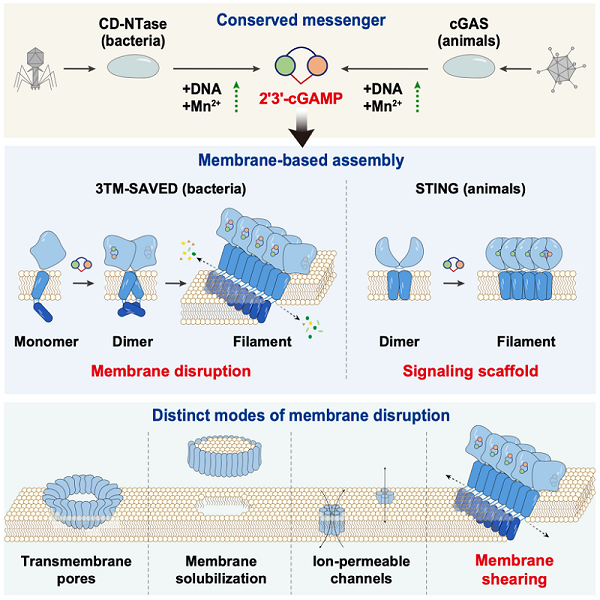 综上,这项研究从信号分子、受体机制和效应执行三个层面拓展了我们对天然免疫进化多样性的理解:揭示了2'3'-cGAMP在原核生物中的保守生成机制,阐明了其特异性驱动跨膜效应蛋白变构与高阶装配的过程,并发现了一种此前未被认识的全新膜损伤模式--纵向膜剪切。