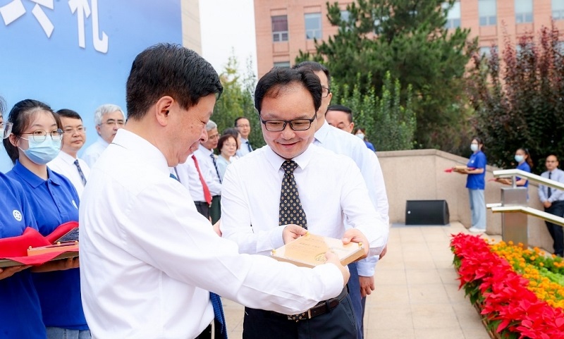 中国科学院副院长、中国科学院大学党委书记、校长李树深院士为生物物理所"领雁金奖"获奖教师卫涛涛研究员颁奖