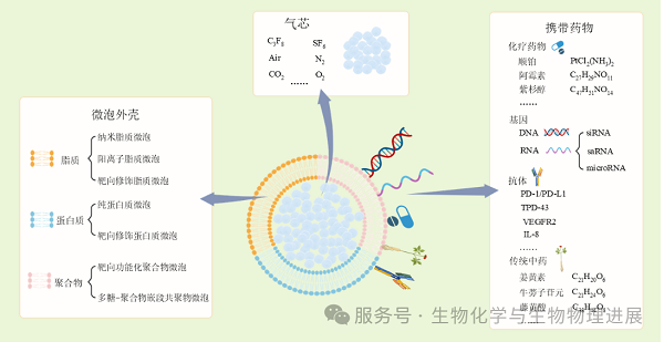 微泡由气体核心及生物相容性外壳两个关键部分组成。气体核心通常填充全氟化碳或六氟化硫,以确保其在血液循环中的稳定性;外壳则由脂质、蛋白质、高分子聚合物等材料构成[6]。得益于这种独特的结构,微泡具有强大的递送潜力,可装载的药物范围广泛,包括传统的化疗药物、中药单体化合物、蛋白质及抗体类药物,以及用于基因治疗的核酸药物[7]。(详情请点击阅读原文)