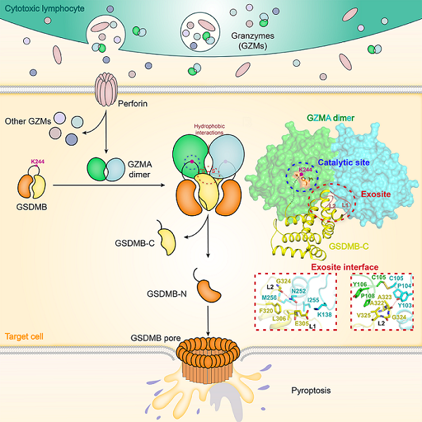 2026年1月26日,中国科学院生物物理研究所丁璟珒研究团队和北京生命科学研究所邵峰研究团队在《Immunity》在线发表题为"Exosite-mediated targeting of GSDMB by dimeric granzyme A in lymphocyte pyroptotic killing"的研究论文,揭示了具有二聚体结构特征的GZMA利用专门的外位点特异性识别焦亡蛋白GSDMB的结构基础,破解了杀伤性淋巴细胞GZMA介导靶细胞焦亡的精确机理。